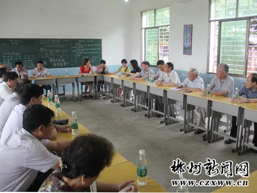 郴州市教育基金会领导实地考察安仁县龙市乡田心小学,图为听取情况汇报。