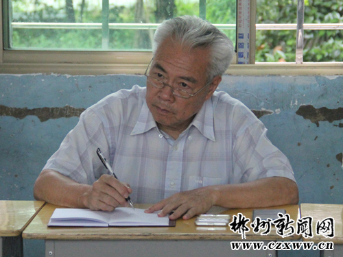 市教育基金会理事长蒋桃生听取田心小学基本情况汇报并认真记录。