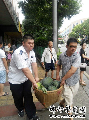 红网郴州站7月8日讯 7月6日上午9时许,北湖区燕泉街道城管执法人员帮助刚下公交车的瓜农将西瓜搬至最近的三元里路临时销售点。据介绍,燕泉街道在辖区燕泉路、龙泉路、香雪路、文星西路等农贸市场周边、次干道及小街小巷申报设置了26处自产自销瓜果临时销售点。为加强管理及提供有效服务,燕泉街道还成立了4个执法队,实行24小时轮流值班制度。