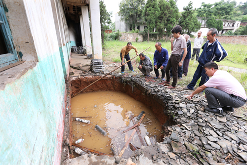 红网郴州站7月9日讯 7月7日,临武县双溪乡南冲村原双溪中学,乡、村干部正测量地面塌陷窟窿的深度。7月5日5时许,连续几天的大雨致使原一所费弃的中学楼房地面塌陷,长达4米高的房柱陷入底层不见踪影。地面塌陷影响了周边群众居住环境安全,该乡、村两级干部防惠于未然,妥善安排有安全隐患的群众撤离。