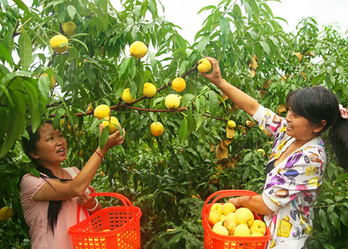 7月29日,游客在自选自摘黄桃。当天,“桂东县四都镇锦绣桃业合作社”的黄桃成熟并正式开园,吸引周边及在桂东度假避暑的大批省、市内外游客前来采摘。