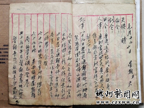 红网郴州站8月6日讯(通讯员 朱国平 郭延清)7月30日,从汝城县档案局了解到,该局工作人员在整理抗战档案时发现一册71年前抗战期间工兵团值日簿。该簿土纸封面呈褐色,上面书有“值日簿”字样,部队番号印章已模糊。