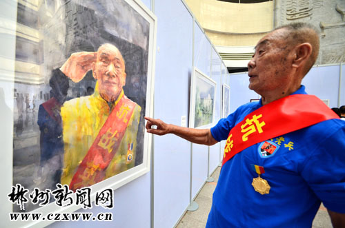 图为抗战老兵在观赏美术作品。