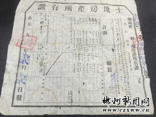 红网郴州站8月19日讯(记者 何一航 通讯员 肖琦文)日前,栖凤渡国土资源所工作人员在苏仙区栖凤渡镇丰塘村走访时,无意间发现了一张1953年的“土地房产所有证”。