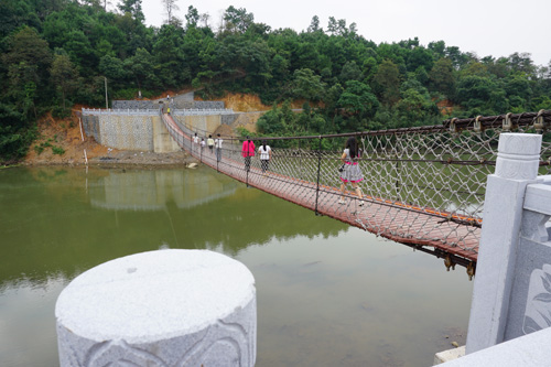 红网郴州站9月18日讯 安仁大石铁索桥经过半年的施工建设,于9月9日竣工并投入使用。该桥位于该县大石林场场部处,投资200多万元,跨度100余米,宽2米。老百姓可从铁索桥,游览桃花岛,并可沿着新修的宽4米的盘山公路登上熊峰山国家森林公园山顶,为大家观光休闲带来了极大方便。(通讯员 何超)