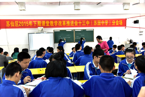 红网郴州站10月13日讯 10月12日,苏仙区2015年课堂教学改革(初中语文)推进活动在市十三中(苏园中学)报告厅举行,来自全区60余名初中语文教师参加了活动。市十三中(苏园中学)李雪娟老师执教的生态课《信客》得到了与会专家和老师们的一致好评。执教老师通过驾轻就熟的小组活动,展示了该校“自主互助探究高效”的生态课堂教学改革模式。