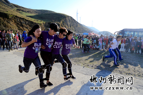 图为户外团体在草原举行团队游戏。