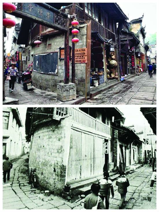 清咸丰七年,也就是1857年,年仅21岁的田兴恕率“虎威营”1200勇士在英岗岭孤军作战,被石达开部下重兵包围,激战中,田兴恕左手被砍掉3个手指头,身上多处受伤,田兴恕不顾身上血流不止,手提大刀,在敌营中左突右冲,毙杀太平军千余人。1861年端午节,气焰嚣张的法国教会传教士与老百姓发生冲突,气愤至极的田兴恕密令将4名修士绑赴刑场斩首,这就是有名的“青岩教案”。案后,软弱的清政府迫于压力,将田兴恕贵州巡抚、钦差大臣之职撤除,仅保留提督一职,不久,他便解甲归田,回到了凤凰。图为凤凰街市新老对比。