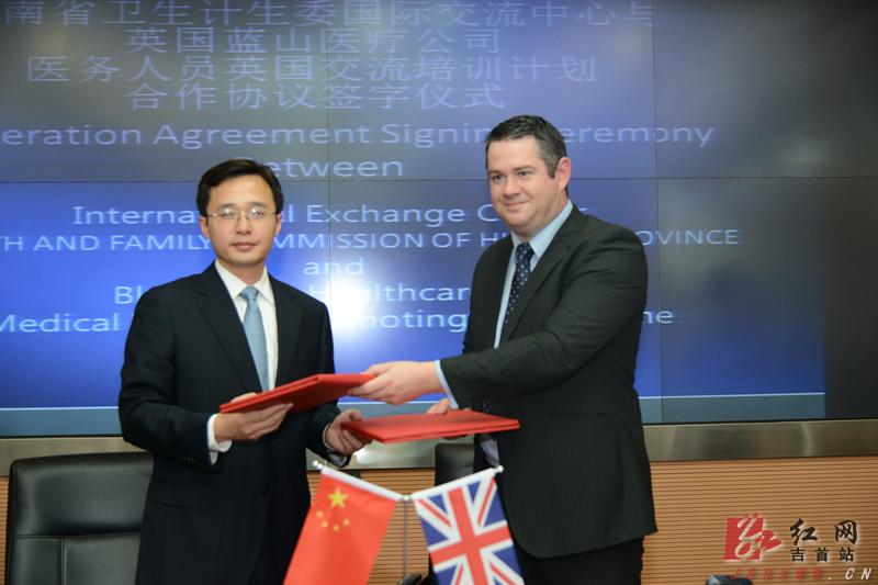 湖南省卫计委国际交流中心唐主任和英国蓝山医疗合作公司项目总监交换协议书。