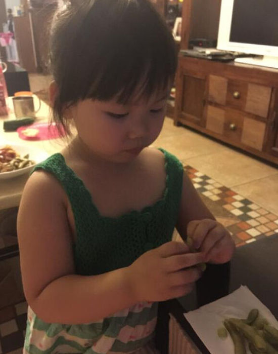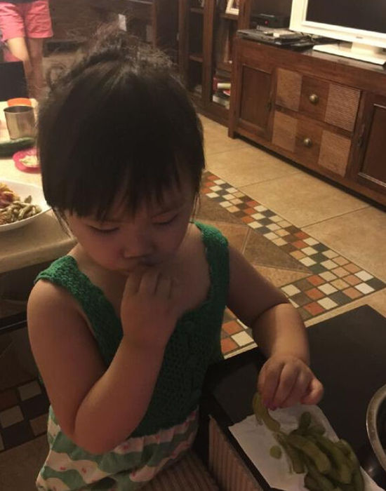 7月12日晚,王宝强老婆在微博晒出一组女儿乖巧吃毛豆的可爱照片,并称:“来小朋友家吃饭,吃肉丸子不小心咬到自己的手,哭惨了,默默的吃毛豆去了,不嗨森啦!”