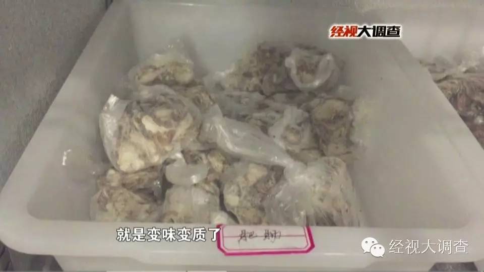在作坊里还有一间很大的仓库,而仓库最里面的地上堆放着暗淡发白、没有血色的冰冻鸡肉。仓库的一旁,还放着两个大冰柜,冰柜里面放满了没有厂名厂址和生产时间的猪肉鸡肉,散发着刺鼻的味道。